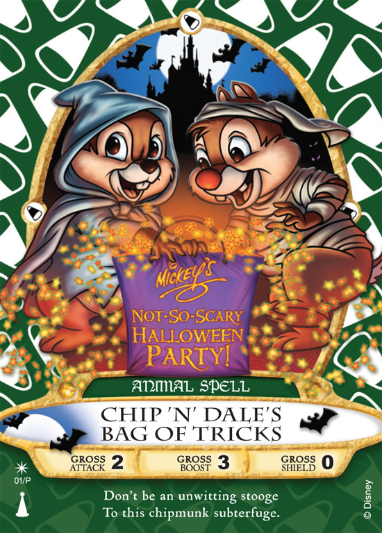 Update: 09/27/12 There was a special card released for Mickey’s Not So Scary Halloween Party. (picture in checklist below) Unlike the special Cast Member card, this is a normal sized card. It features Chip ‘n Dale’s Bag of Tricks and is numbered 01/P.