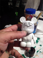 LS: I want to say I used a drill because it seems easiest…but since I didn’t have a drill lying around I had to poke holes on each side with box cutters and I “drilled” into the head with a screwdriver. After some cleaning and sanding, he had the arm holes he needed!