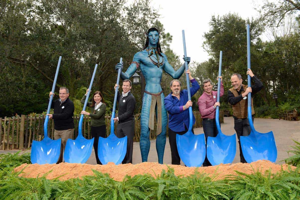 Earlier this week, the long-awaited ground breaking ceremony was held in former Camp Minnie-Mickey for the AVATAR-themed land at Disney’s Animal Kingdom. George Kalogridis, president of Walt Disney World Resort; Meg Crofton, president of Walt Disney Parks and Resorts Operations, United States and France; Tom Staggs, chairman, Walt Disney Parks and Resorts; a Na’vi; Jon Landau, AVATAR Producer; Bruce Vaughn, chief creative executive of Walt Disney Imagineering; and Joe Rohde, creative executive, Walt Disney Imagineering, pose Jan. 8, 2014 during the ceremonial groundbreaking.