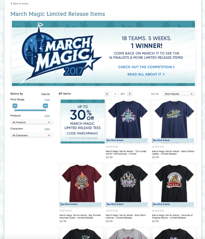 Guests will also find graphic T-shirts and posters featuring March Magic 2017 teams on DisneyStore.com from March 14 to April 4, 2017. This year, all items will be carried throughout the duration of the tournament. It appears there are even some not in the tournament, including the Adventureland Swirl and the Cranium Commanders.