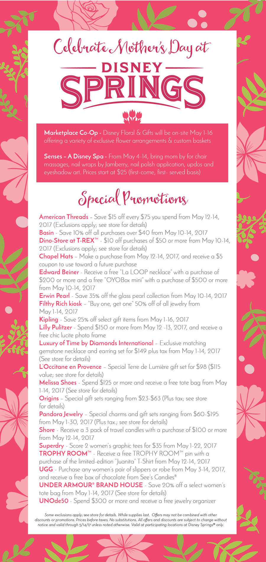 This Mother’s Day, Disney Springs has put together some special offerings and promotions to ‘pamper’ your mom with. Take a look at the flyer below: