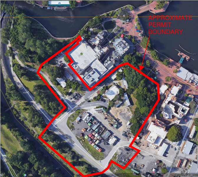 You can see from the aerial image that the area encompassed by the permit entails all of the empty expansion pad between France and Morocco (expansion pads were originally designated for the addition of countries to World Showcase), as well as some additional space directly behind the France pavilion. The show building will be built on the expansion pad, and the queue area will travel behind the existing France pavilion and connect to the existing guest area in front of the pavilion.