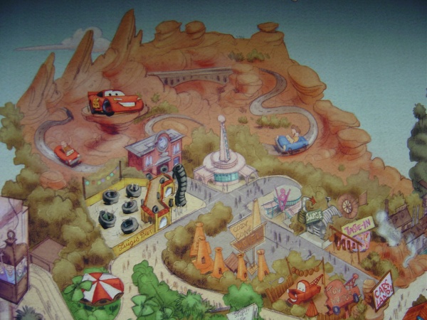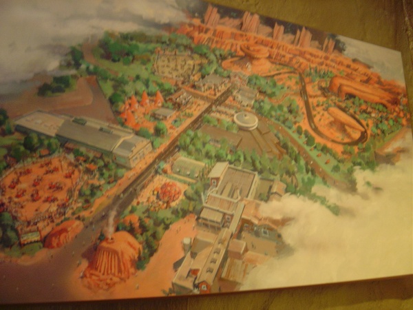 An amazing overview map of Cars Land. The mountain range in the back is the whole show building for Radiator Springs Racers!