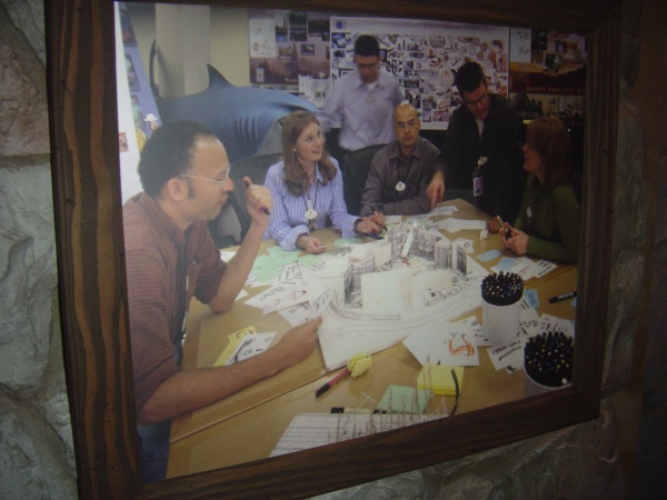 A photo of various Imagineers in a meeting at the Blue Sky Cellar Screening Room.