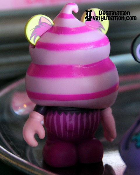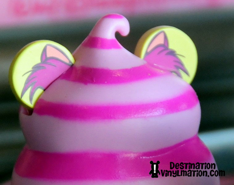 I purchased the Cheshire Cat, my favorite design out of the six. The big selling point for the Bakery series is the removable frosting. It pulls off to uncover the character’s face. So I tore open the box, reached inside, and was shocked at what I felt. I was expecting a hard plastic shell that slipped on and off. Instead, the frosting is a soft, rubbery vinyl cover.