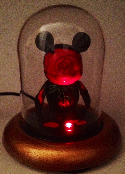 Brian Shapiro: Beauty and the Beast is my favorite Disney animated film, and I wanted to do a vinyl inspired by the movie. When I tried to think of which character to feature, I saw a lot of them had already been done by other custom artists. Then I noticed that a common thread in a lot of Beauty and the Beast merchandise like posters and DVD’s was the Enchanted Rose, and I realized that this was almost like another character in the film. It played such a huge part in the story, a little time-clock counting down. I thought it would adapt perfectly to the Vinylmation canvas. In the movie, the rose appears more wilted, but I took some artistic license to make the flower portion fill the entire head of the vinyl. The stem fitted perfectly on the torso, and the arms were an ideal place for falling petals to appear suspended in air. Since the rose was inside a glass dome in the movie, I planned from the start to place the completed Vinylmation in one too. I purchased a small glass domed pocket watch display case from eBay and removed the metal watch stand from the wood base. I then installed a red LED light in the base to cast a dim red glow on the figure at night.