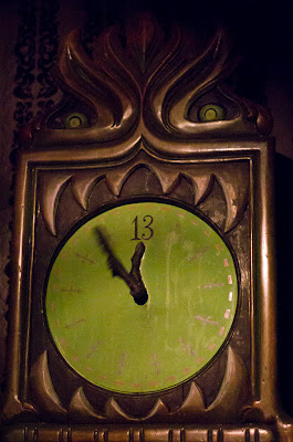This clock face awaits guests in the hallway of the Haunted Mansion.
