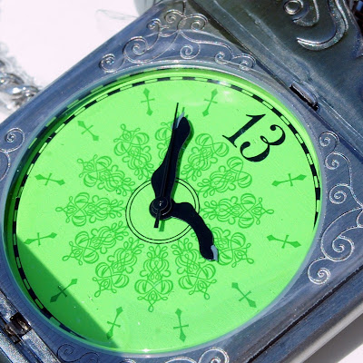 With a push of a button at the top of the watch, the door pops open for a closer look at the clock. Caley designed it with the same pattern found on the original… a 13 in place of the 12 and of course the creepy figures that swing around keeping the time. It is designed with precision and both the figure and watch seem produced with great care. They come securely bubble wrapped and packaged in Styrofoam. Once opened, they can be displayed inside a plastic case.