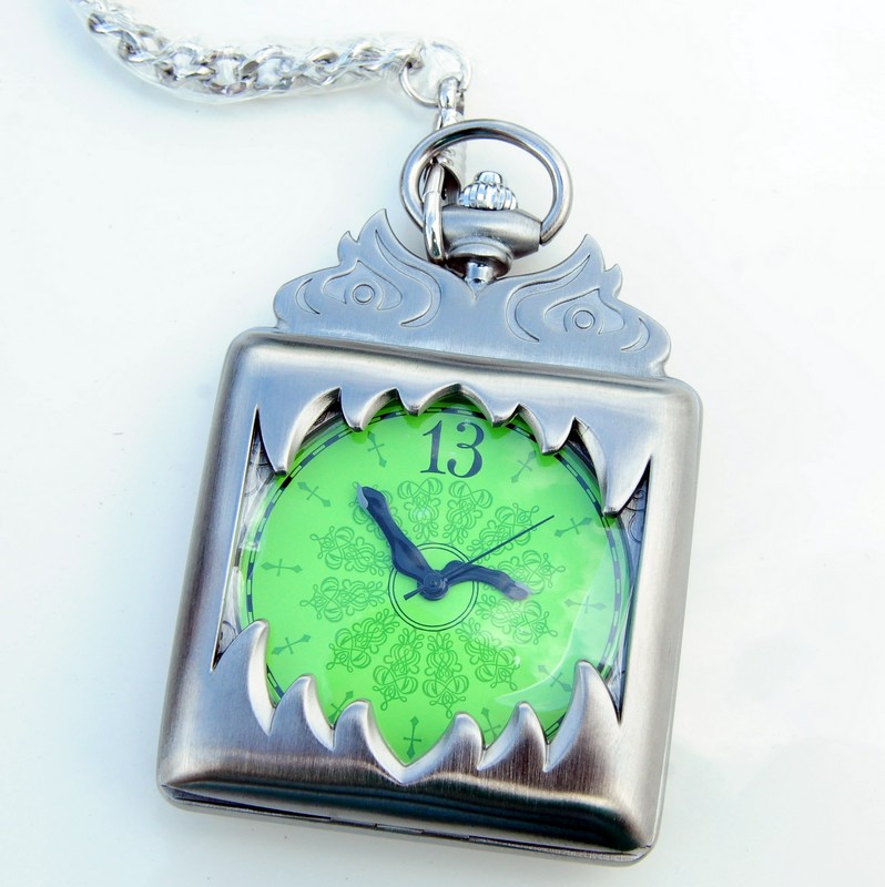 With a push of a button at the top of the watch, the door pops open for a closer look at the clock. Caley designed it with the same pattern found on the original… a 13 in place of the 12 and of course the creepy figures that swing around keeping the time. It is designed with precision and both the figure and watch seem produced with great care. They come securely bubble wrapped and packaged in Styrofoam. Once opened, they can be displayed inside a plastic case.