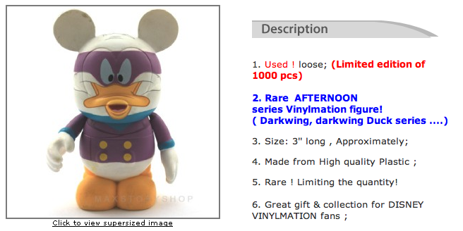 Another unfortunate happening in the Vinylmation community. Edith sent us an email with links to more Hong Kong eBay auctions. This time for Darkwing Duck Disney Afternoons.