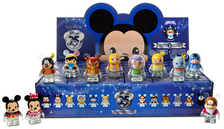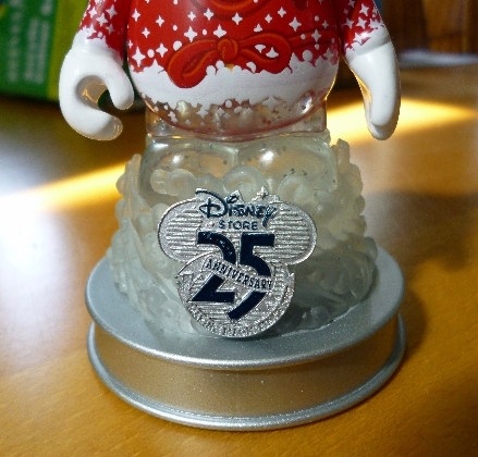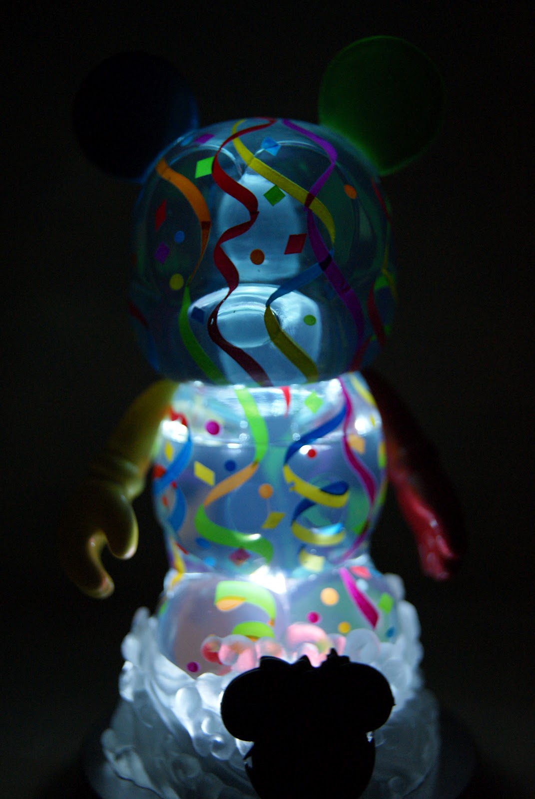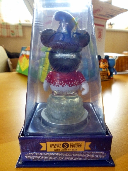 He comes in an unusual shaped package (similar to combo toppers) however I’m assuming this was to enable Mickey to be presented with the Sorcerer’s hat on. The base is the same as the special display window boxes, however on the bottom there is a hole for which you can turn on and try the light up base, so it’s not great for display purposes. However it does look nice as it’s decorated with silver shiny sparkles along with the Vinylmation and Disney Store 25th logo. The plastic part of the packaging does break easily as I was given two which had been cracked, so be careful with that. The back sides and top have a blue film with sparkles and incorporating the sorcerers hat design with clear areas shaped like moons and stars cover the film. On the top is the Disney store logo. And for a nice little touch, on the back it says Celebrating 25 Years of Magic with Tinkerbell waving her wand. Although the decoration of box is nice, it does means it’s hard to see the figure and identify any areas of poor quality.