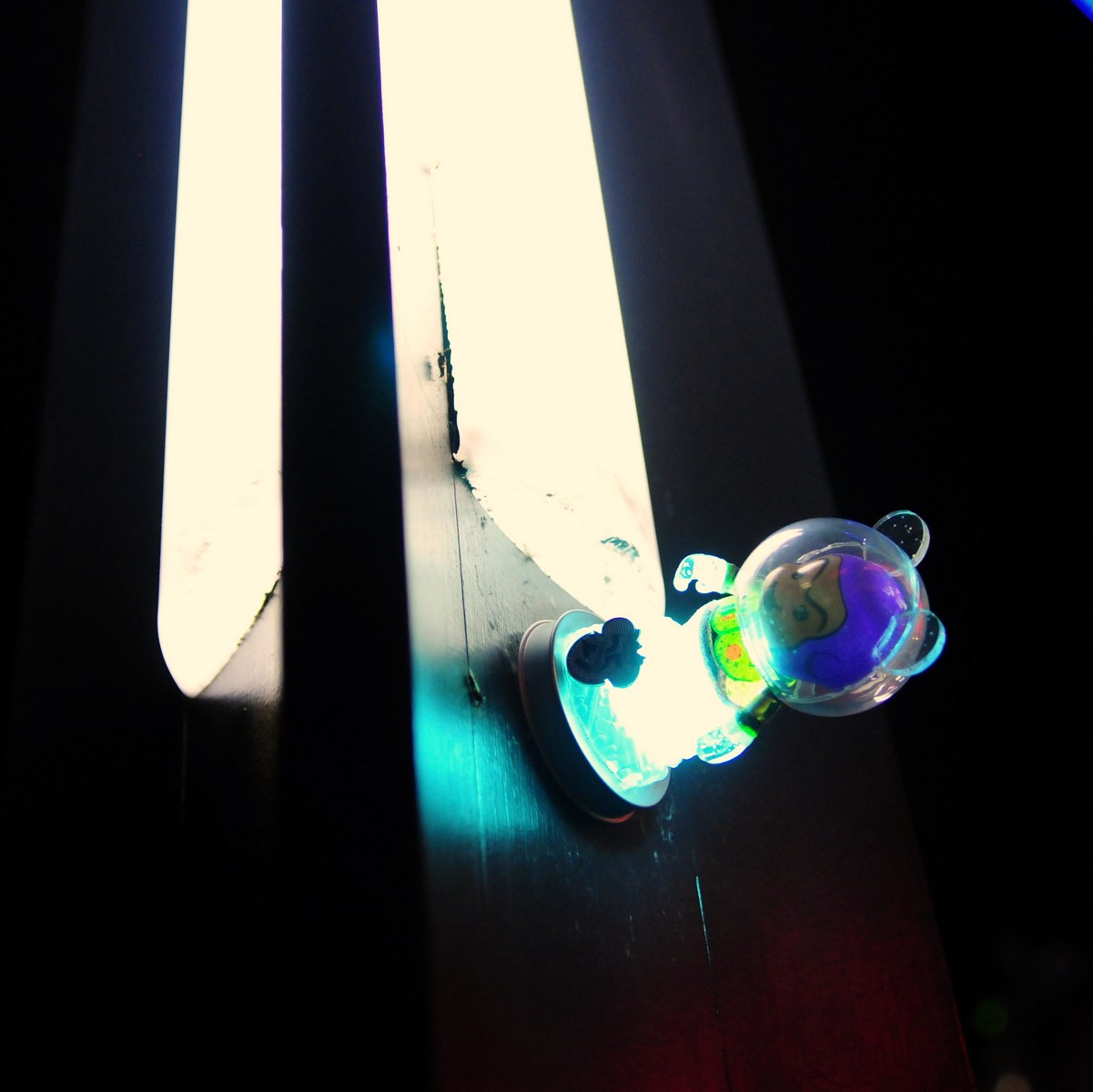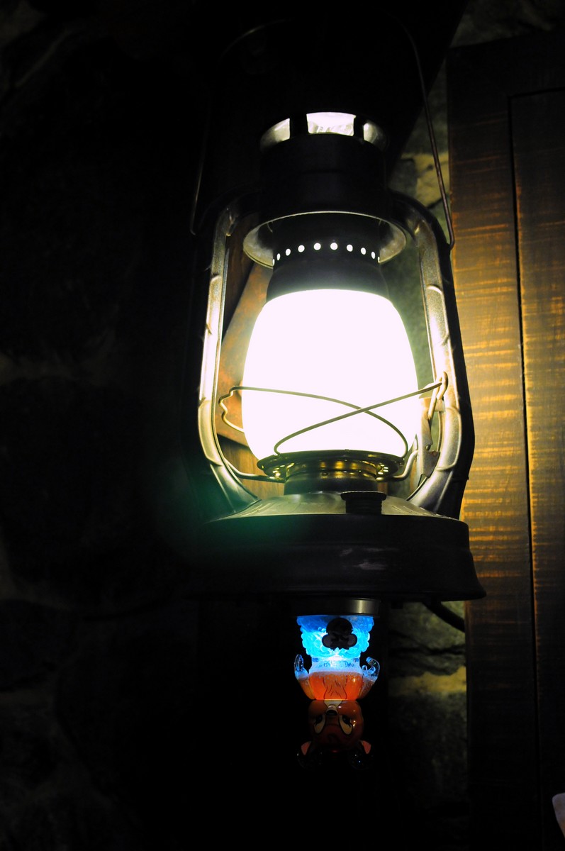 A detailed Disney store 25th Anniversary logo proudly stands out on the front, which is a bit of a shame as it won’t make sense when displaying other non 25th Anniversary Vinylmations. The very bottom of the base is a metallic silver which does help in a small way to intensify the light. Turn the base over and you’ll find the compartment for the batteries, a switch and a button. With the switch you can change from “Try” mode, in which the base can only be lit up by pressing the button continuously, or the “On” mode so that when you press the button the light will stay on until you press the button again. The light itself comes from three white LED bulbs, arranged in a triangle shape, be warned they are very bright so don’t directly look at them without a figure being in the base. The brightness does mean it can light up a small portion of the area around it. Not only does the base lite up, but it adds an extra 2cm (approx. 1 inch) to a figure’s height.