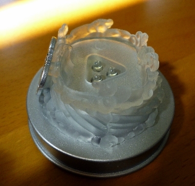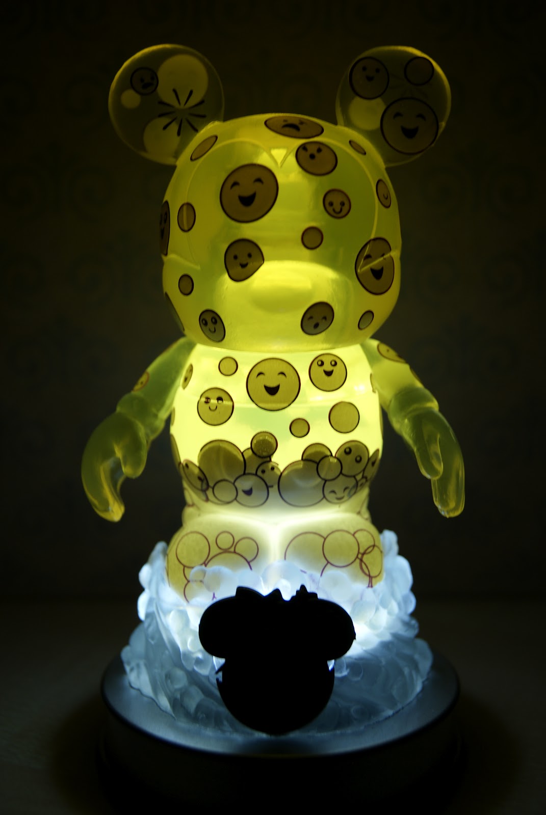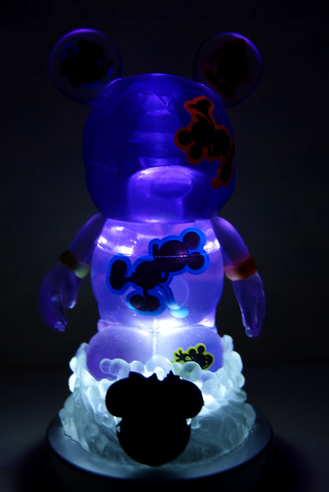 The main reason for why I bought mine was for the light up base. It’s a great little extra way to display your clear and translucent Vinylmations! Remember only Vinylmations with clear feet can light, with the better effects when both the feet and body are clear and even better when the whole vinylmation is on a clear figure. It works great with Ariel’s Undersea Adventure, 100 years of Magic hat, Alien, Obi Wan Variant, Furry Friends Cheshire Cat and the clear Pink elephants. Both old mold and new mold fit snugly into the base. It is very sturdy, you can even turn them upside down and they won’t fall out. Although none of my figure’s feet have been scratched, I would take care when removing and inserting them into the base. Overall the design is filled with nice translucent cloud shapes that swirl around your vinylmation’s feet and also means it partially lights up when switched on.