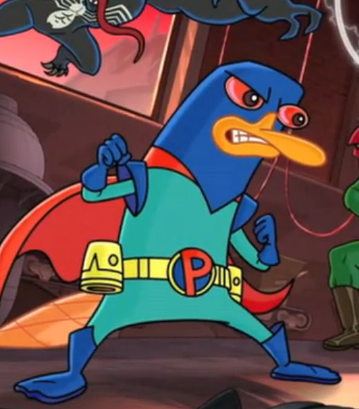 I love it! Agent P is in his superhero costume and has a “P” on his belt. No hat for Agent P, but by the piece seen between the head and body, he does have a cape attached. The episode, a crossover between Phineas and Ferb and Marvel, is set to air this summer.