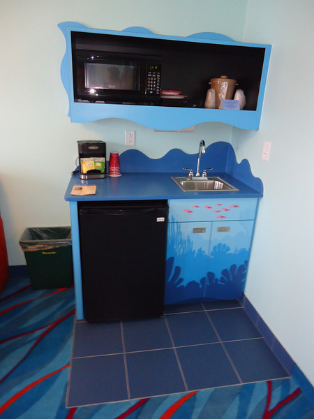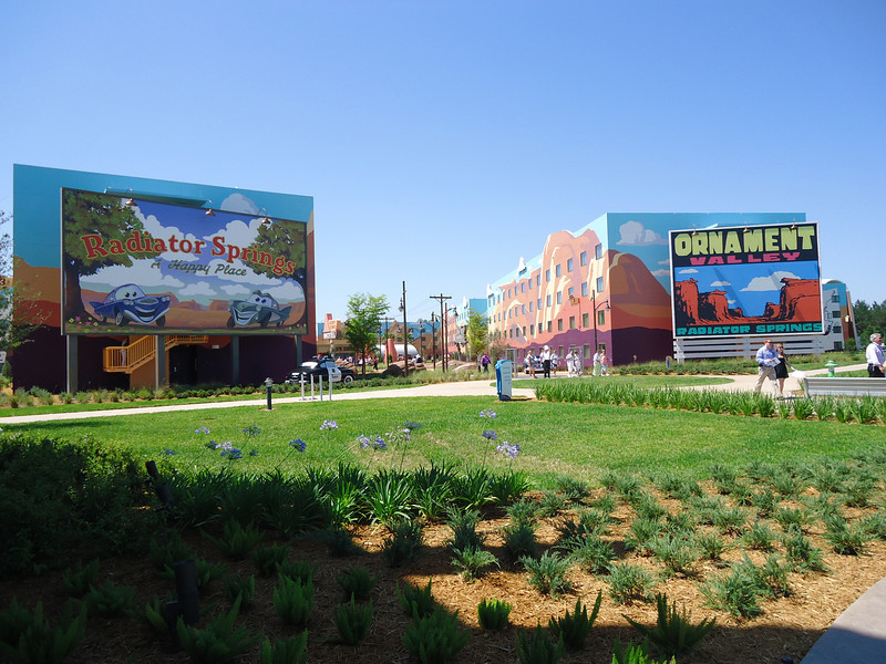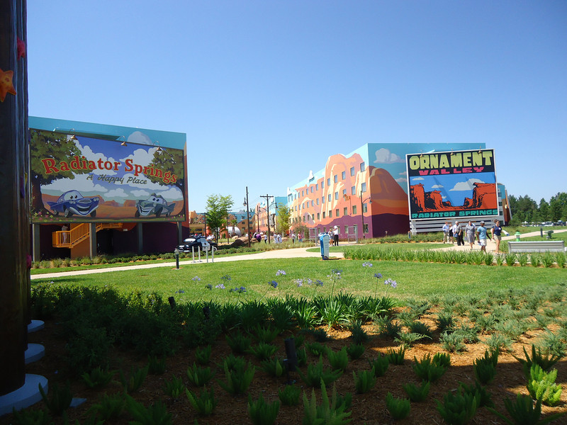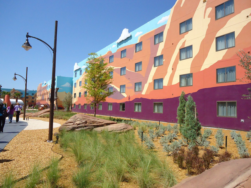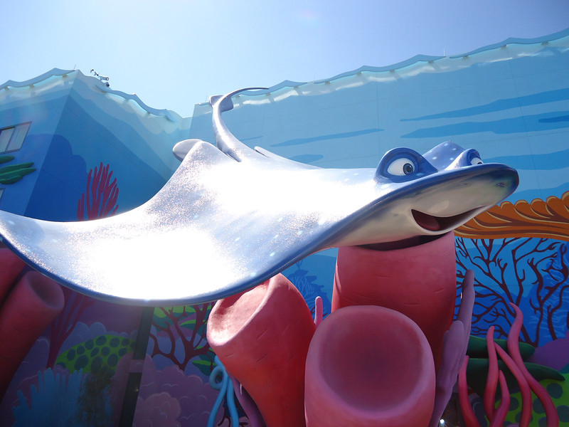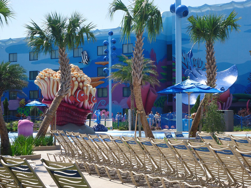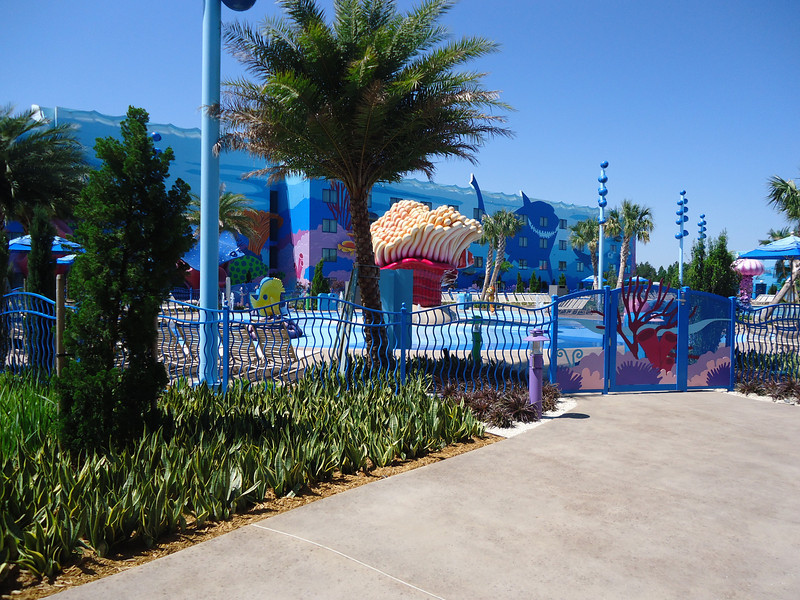 - Disney’s Art of Animation Resort – Walt Disney World’s newest resort offers three pools: The Big Blue Pool, Cozy Cone Pool, and Flippin’ Fins Pool. The Big Blue Pool, themed after Finding Nemo, is the largest resort pool on property, at over 300,000 gallons. The Drop Off near the pool offers drinks and food. The Big Blue Pool is the only pool with a nearby bar, and the first Disney pool to have underwater speakers. All three pools are available to guests staying at the resort and are beautifully themed, with large set pieces modeled after their respective movies. The Cozy Cone and Flippin’ Fins Pools, both much smaller than The Big Blue Pool, are themed to Cars and The Little Mermaid, respectively,