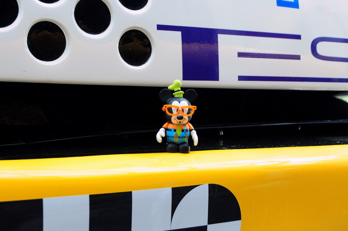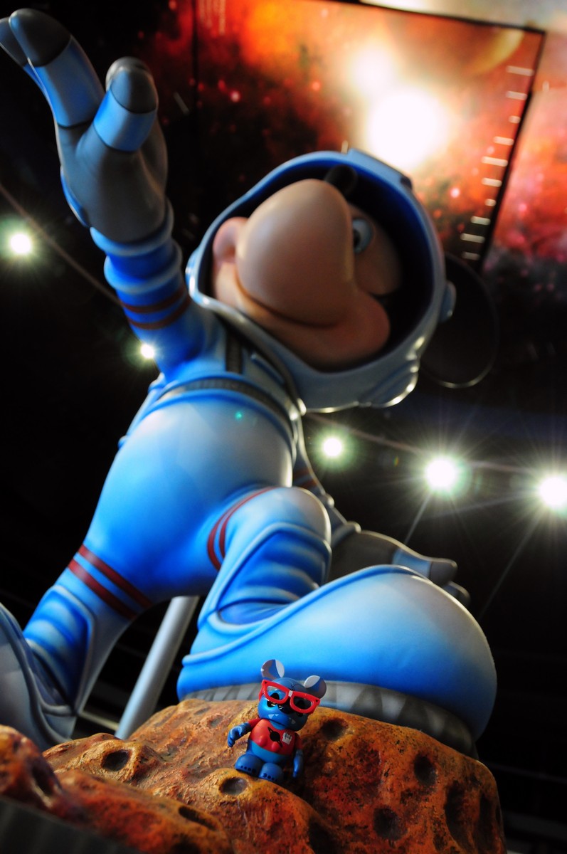 Speaking of experiments… Stitch is in awe of the Mickey Spaceman statue…