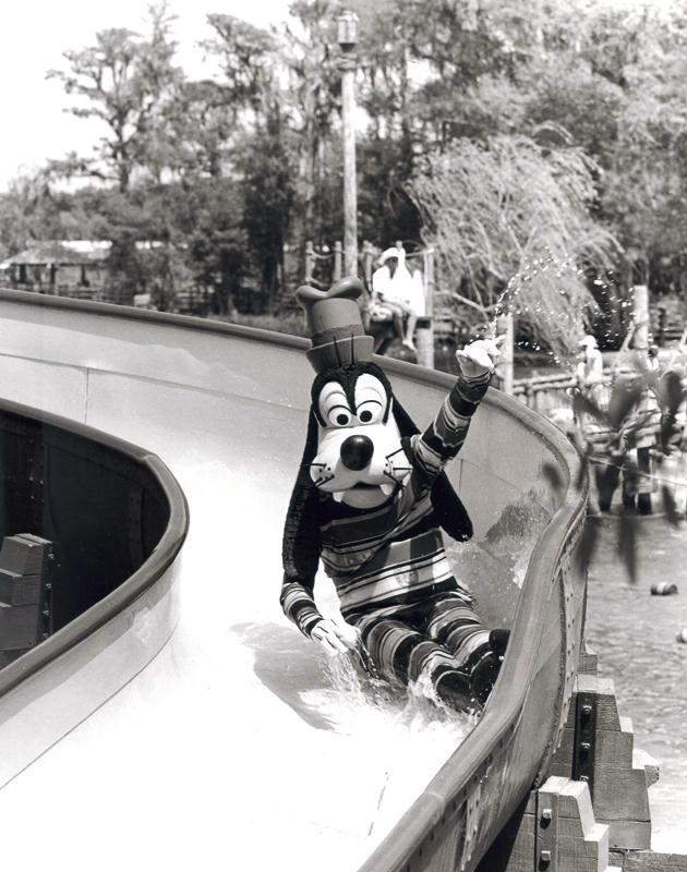 Goofy always seemed to be tossed into the water at WDW… remember water skiing Goofy? Well I also found this 1981 picture at MainStGazette.com of Goofy enjoying a River Country slide.