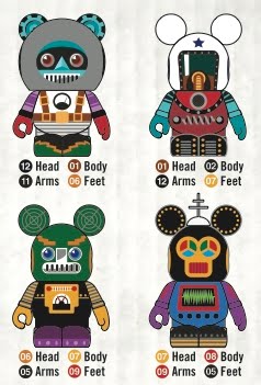 Details: This set is promoted as “Mix ‘n Match.” In a single blind box, you will receive a robot with mixed up parts. A head, a body, feet and 2 arms from 4 different Robots. You can collect the mixed matched bots, make your own combos or find the missing parts and put together the artists original Robot design… or the “correct” version. This set was designed by Bill Davis. Unlike Robots 1, this second series was designed by a single artist and will not be a Disney Store exclusive product.