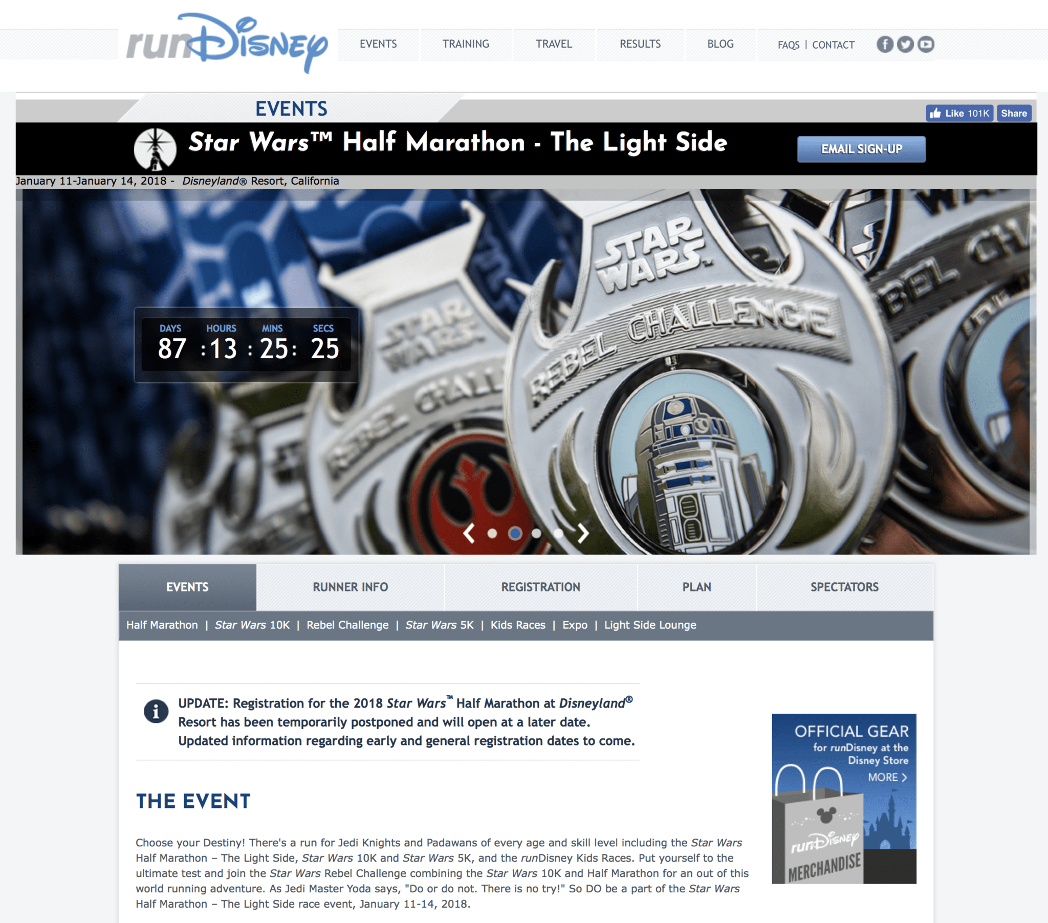 The Star Wars Half Marathon – The Light Side was set to happen at the Disneyland Resort in January and has had its registration delayed indefinitely, leading many to believe the event may be cancelled altogether now. Typically, registration for this event opens several months in advance.