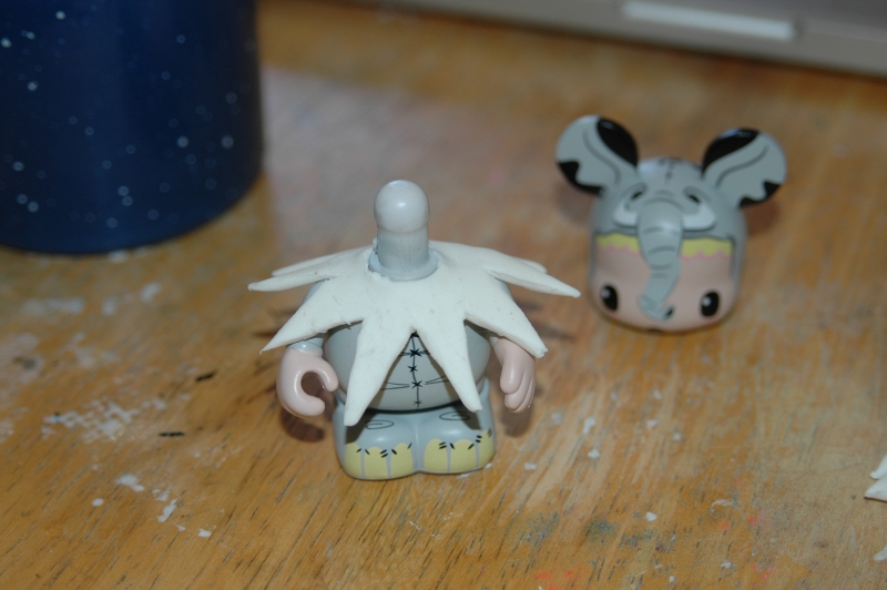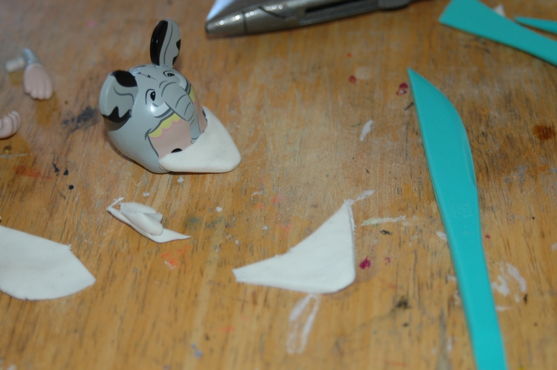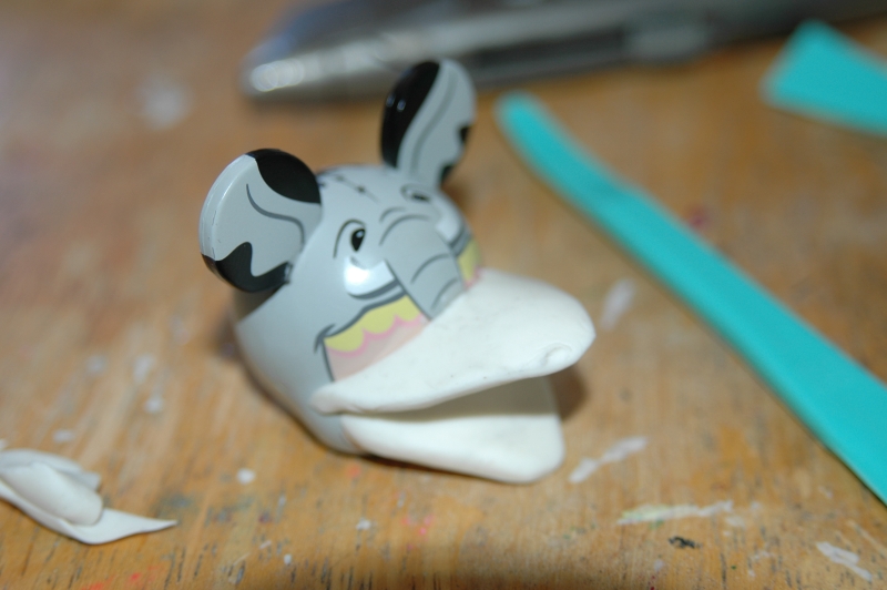 The great thing about sculpting onto Vinylmation is that if you want to stick with the soft style of Vinylmation accessories like the hats, you don’t need to be great at sculpting because what you’re making doesn’t need a ton of detail. There are several different sculpting compounds to use. Another option is Super Sculpey. Regular Sculpey is too brittle to use, and chips easily, but the Super variety is stronger. I don’t like Sculpey personally because you have to either bake it or bowl it for it to harden, and I hate risking the vinyl by putting it in an oven (not to mention that vinyl gives off toxic gases if heated high enough.) Another option is epoxy putty, but you have to get the right stuff. Don’t use the stuff at home depot that fixes leaky pipes, get something like Games Workshop’s “Green Stuff”. It’s a two part compound that air dries and holds detail very well. What I used on Donald’s beak, and is one of my personal favorites, and kind of a secret, is a kind of clay called Makins Clay. It’s a strong, yet pliable air dry clay that is water based. It’s easy to sculpt into a smooth shape, dries rock hard, and is tolerant of a wide range or temperatures. The only downside is that it doesn’t hold tiny detail well, so if you’re sculpting really intricate stuff, a good epoxy is a better bet. And do not use Crayola air dry clay, it is absolutely terrible.