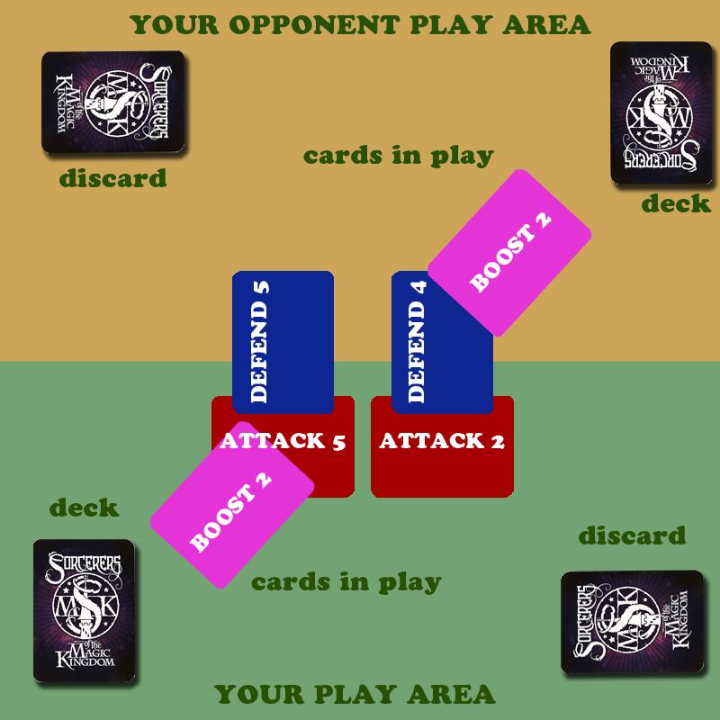 If the ATTACKING card has a higher number of points, the DEFENDING card is placed in the DISCARD pile (along with any BOOST cards) and the remainder of ATTACK – DEFENSE is figured. This is the DAMAGE to the opponent, and this number is removed from the MAGIC POINT TOTAL of the defending opponent.