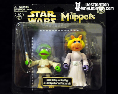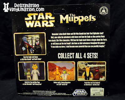 There are four different combo sets, each retail for $19.95. Kermit as Luke and Miss Piggy as Princess Leia. Beaker as C3P0 and Bunsen as R2D2. Fozzie as Chewy and Link Hogthrob as Han Solo. Sam the Eagle as Obi Wan and Gonzo as Darth Vader.