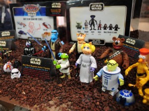 It’s the week before Christmas! Wonderful glorious Christmas. And yesterday I was among the hustle and bustle of the Disney Christmas shoppers at Downtown Disney Orlando. I began of course by stopping off at D-Street to do some trading and pick up some new Vinylmation. I then made my way over to the World of Disney store. I figured a question mark tie would make a good gift for MC this year. You can’t poke your eye out with that. Disappointed that they had none, I made my way over to the toy department. When, what to my wondering eyes should appear? But Muppets Star Wars Series One! A set of eight tiny action figures.