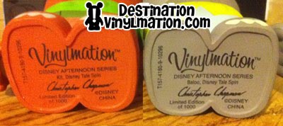 First off, the back of the box is awesome. While the front and sides are covered with the paint splatters that were reminiscent of the Disney Afternoons promos, the back was a big change. A nice black background with shiny black lines covering it. The lines form pictures of Louie the bartender, Kit, Baloo, and Molly. The back also notes the edition size: 1000. Both hats look nice, with Baloo’s cap actually an accessory. And for all you Combo Contest fans, it does come off!