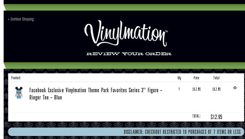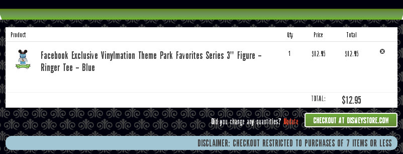 The button links to a Checkout page at DisneyStore.com. This means that you can add whatever you want from Facebook, including the Facebook exclusive figure, and then check out at DisneyStore.com receiving all the benefits there in. Meaning you can then add other items, Vinylmation or not, from the Disney Store into your cart. You can also apply all discount codes including free shipping. You can also of course log into your DisneyStore.com account. I still will not purposefully shop through Facebook unless I really desire the exclusive being offered, but it makes me feel better about the process.