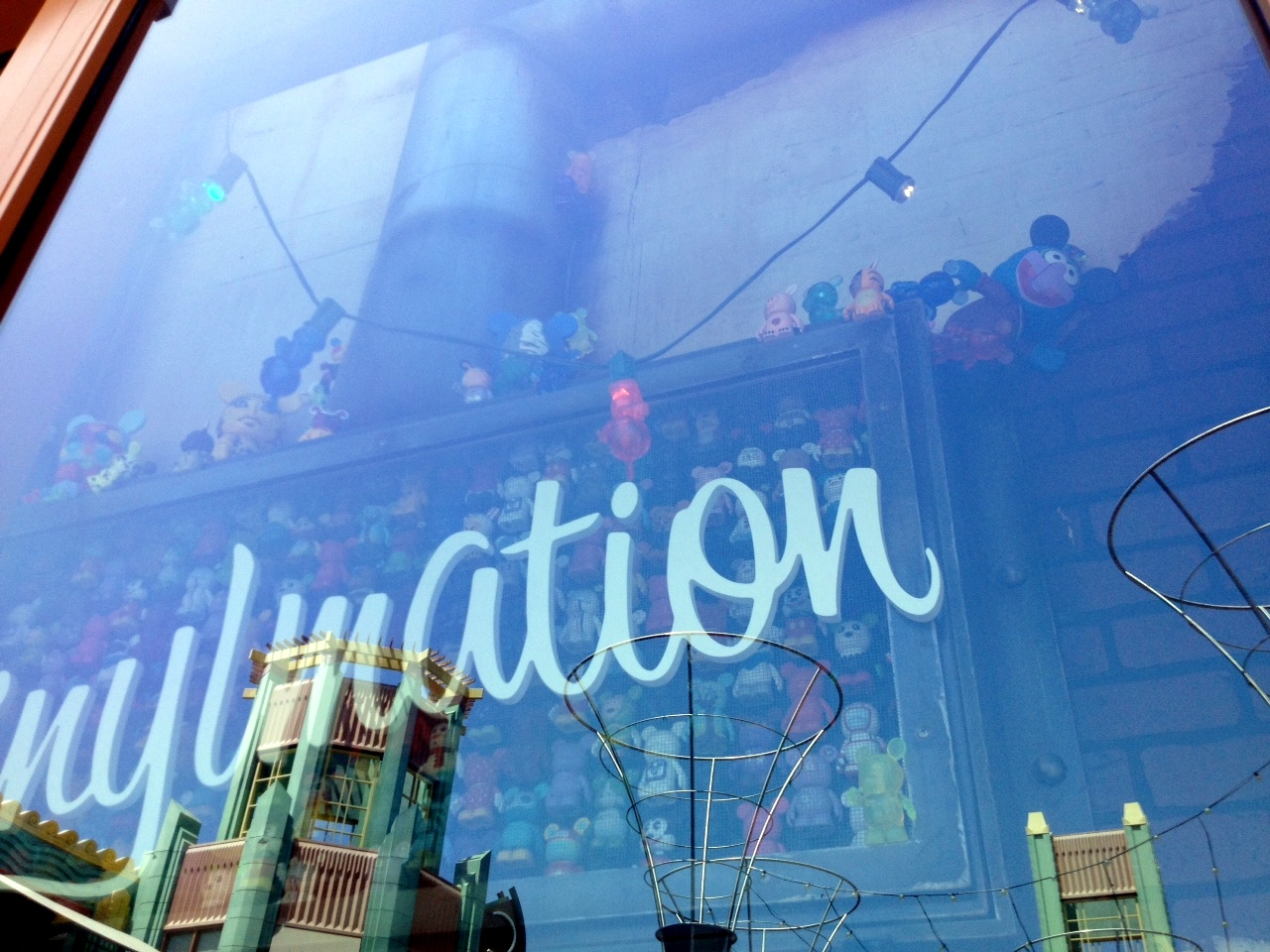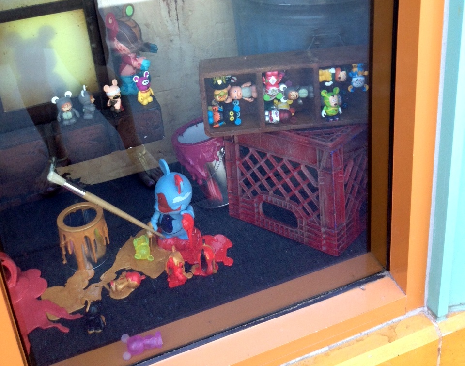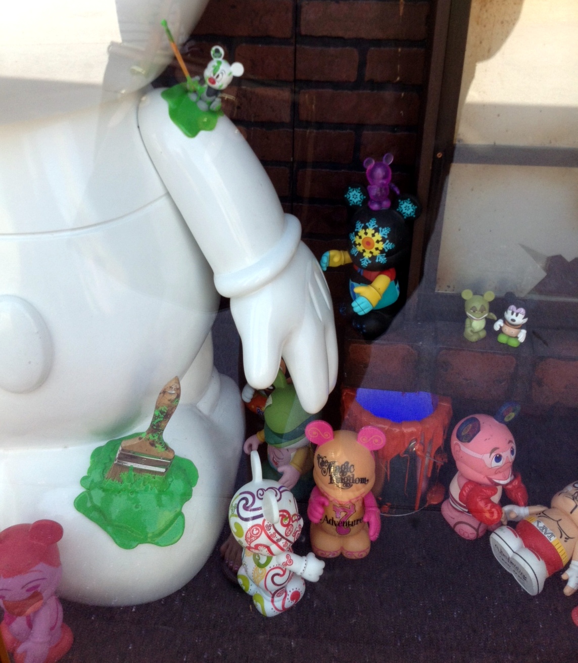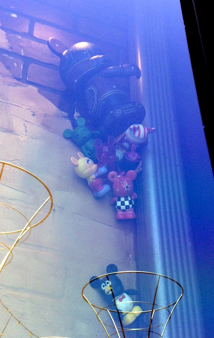 Overall the window is fun and somewhat interactive. There are Vinylmation ALL OVER this window display. Vinylmation hanging at the very top of the window, some trying to paint the large create your own placed in the center of the window, and some just hanging around in boxes and lights.