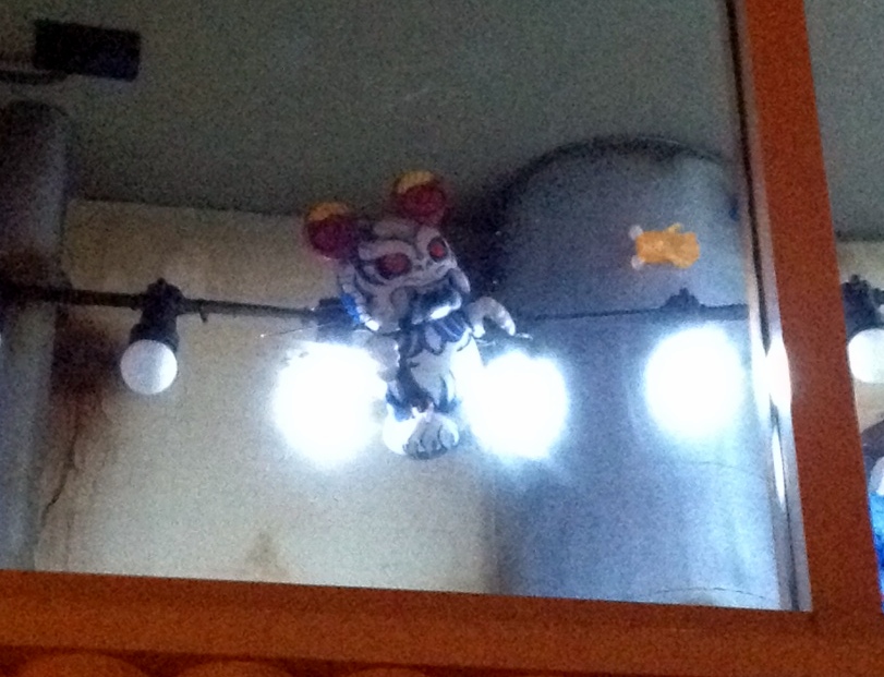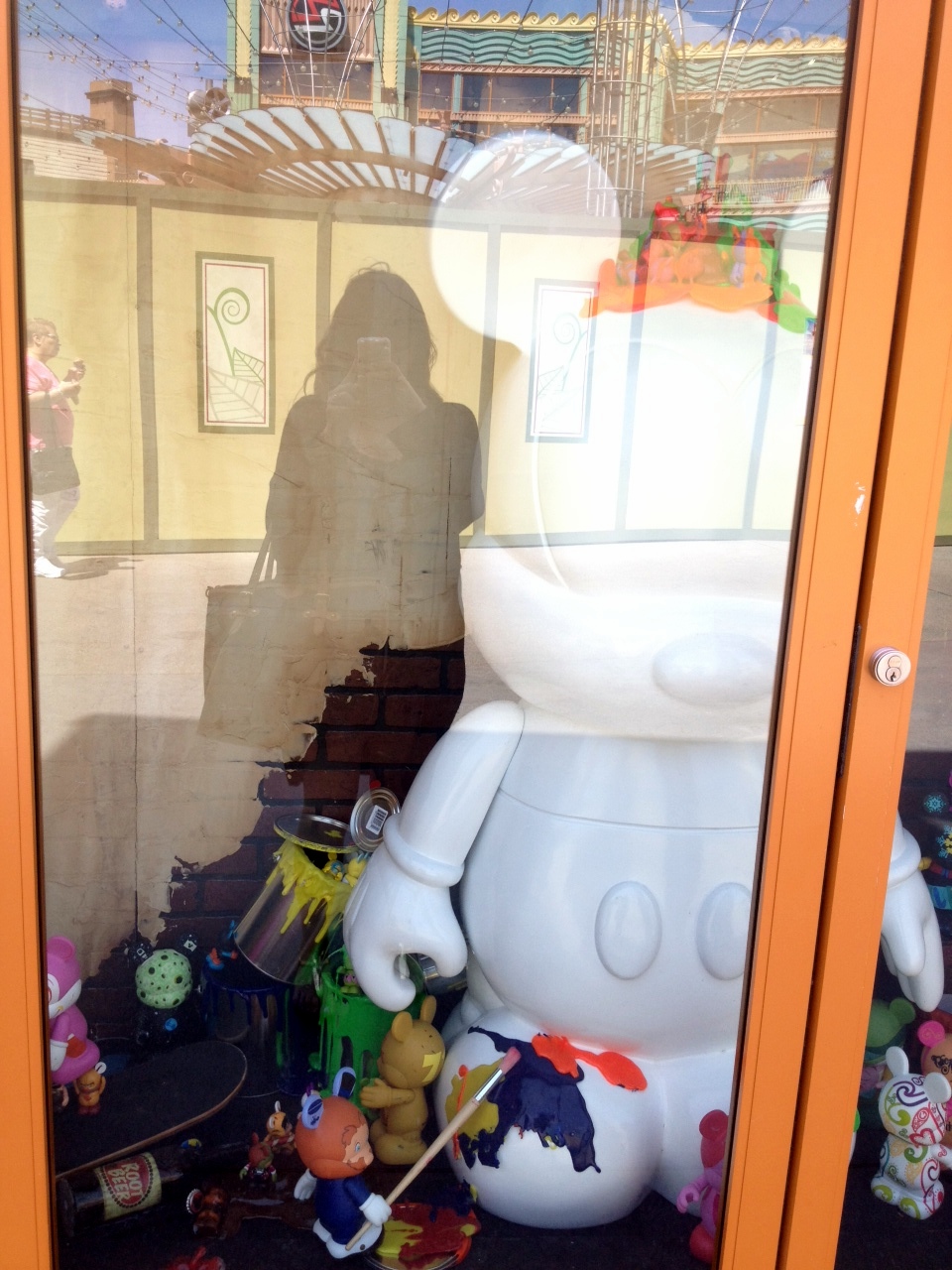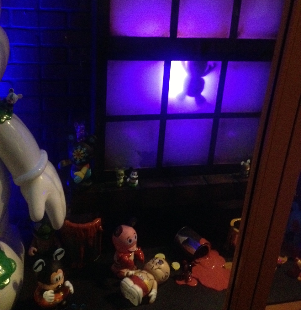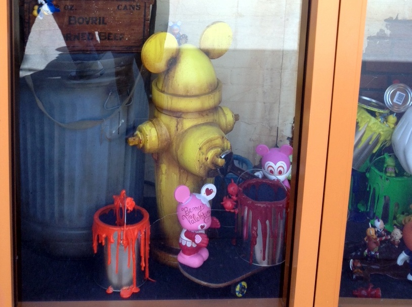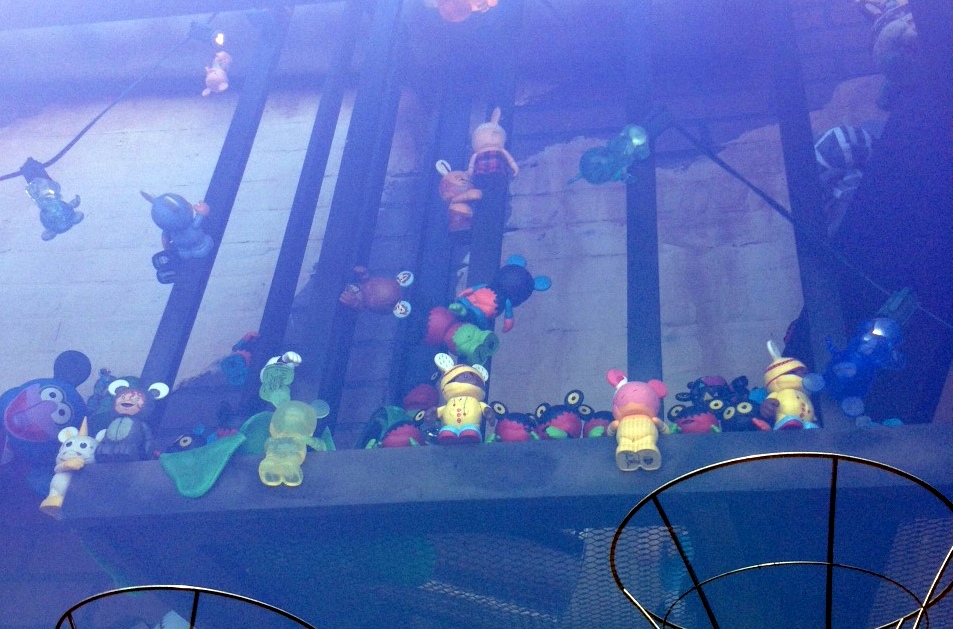 Overall the window is fun and somewhat interactive. There are Vinylmation ALL OVER this window display. Vinylmation hanging at the very top of the window, some trying to paint the large create your own placed in the center of the window, and some just hanging around in boxes and lights.