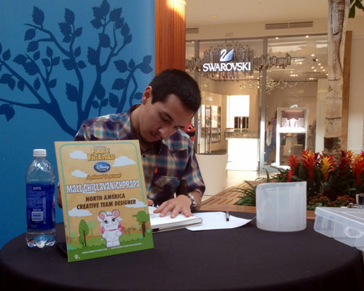 After buying my tray I got into the signing line that was to begin at 10:00 am. I couldn’t wait to open up my tray so I got right to it! After opening my tray I realized that I got the pink Hedgehog variant! Pink is my favorite color and I really wanted this one so I was pretty excited. Little random note, only one pink variant in my tray not two, so I had one pink and one green. The signing began at 10:00 and Thomas was so excited to see everyone come out to Downtown Disney to talk with him and get their Vinylmation signed! Thomas spent a lot of time with each person, taking questions, Vinylmation talk etc. I love that he took time to talk with everyone. He genuinely loves what he does and I mean honestly who doesn’t. Thomas is definitely one of the best Vinylmation artists out there. I was so excited to show him my variant! I had Thomas sign my Dinah, pink Hedgehog and my tray! I couldn’t stop telling him how much I love the set and the art, everything as a whole in this series. He was very happy to see how much I enjoyed the set.